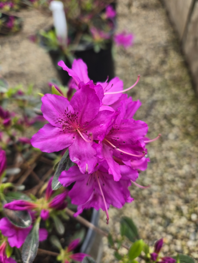 Bright lavender-pink flowers, almost neon in hue. Dark pink spots dot the throats of the flowers